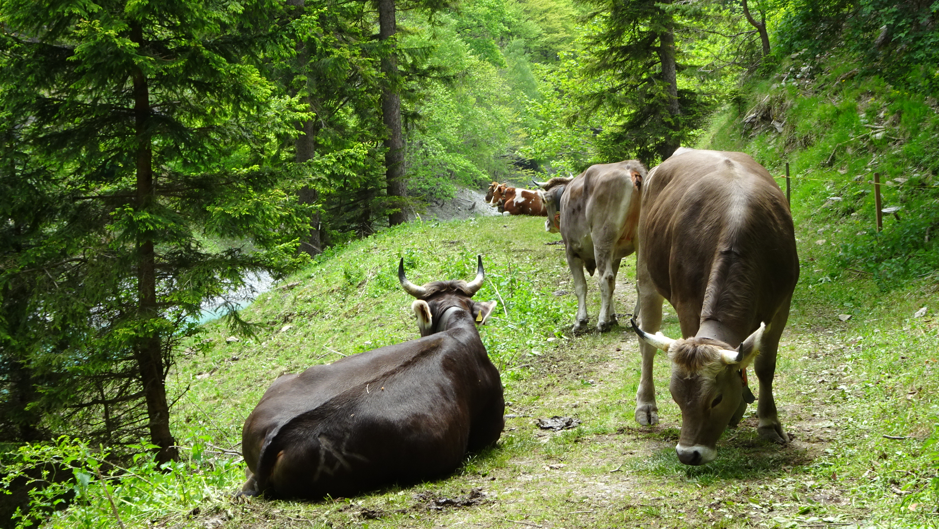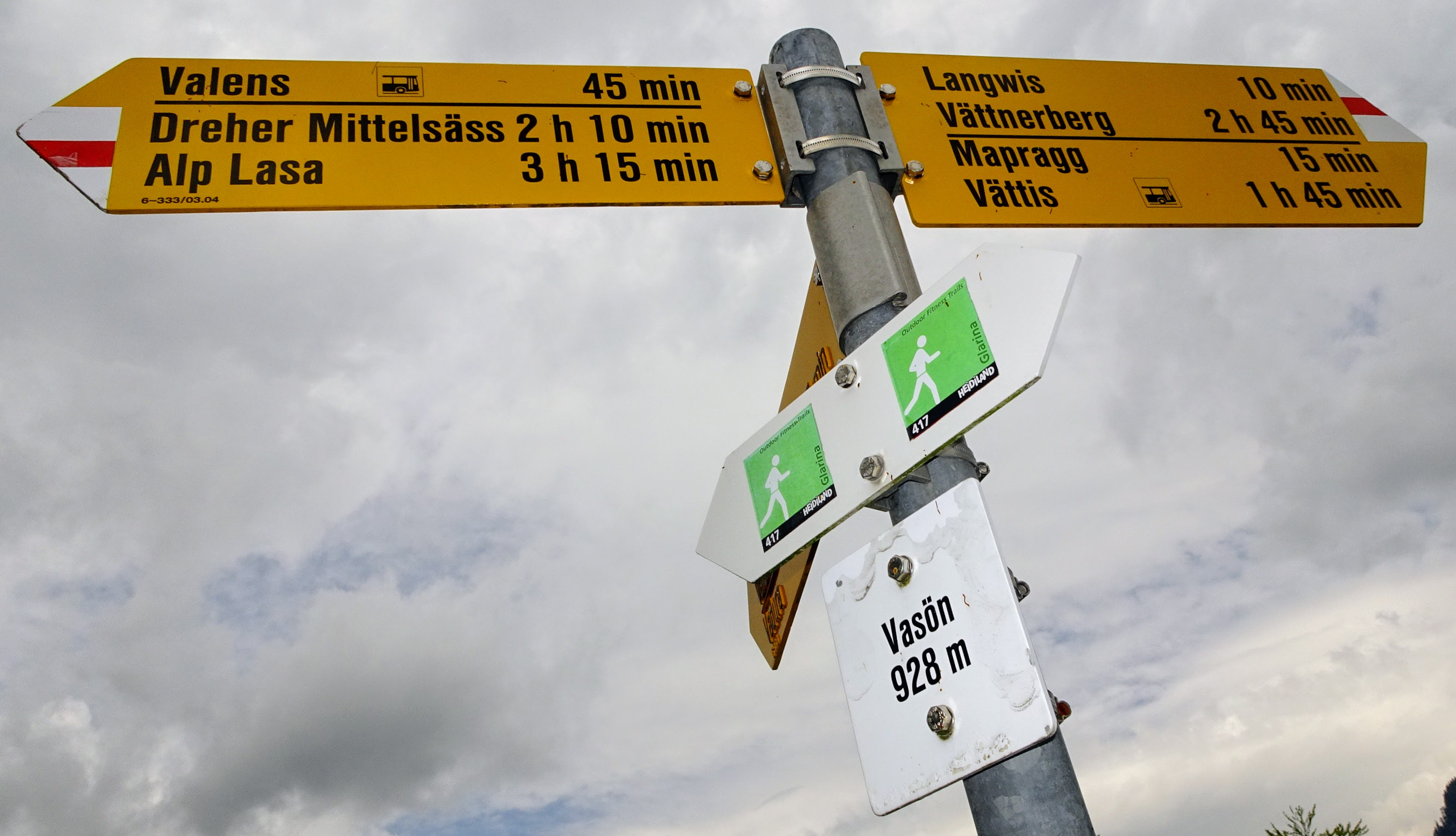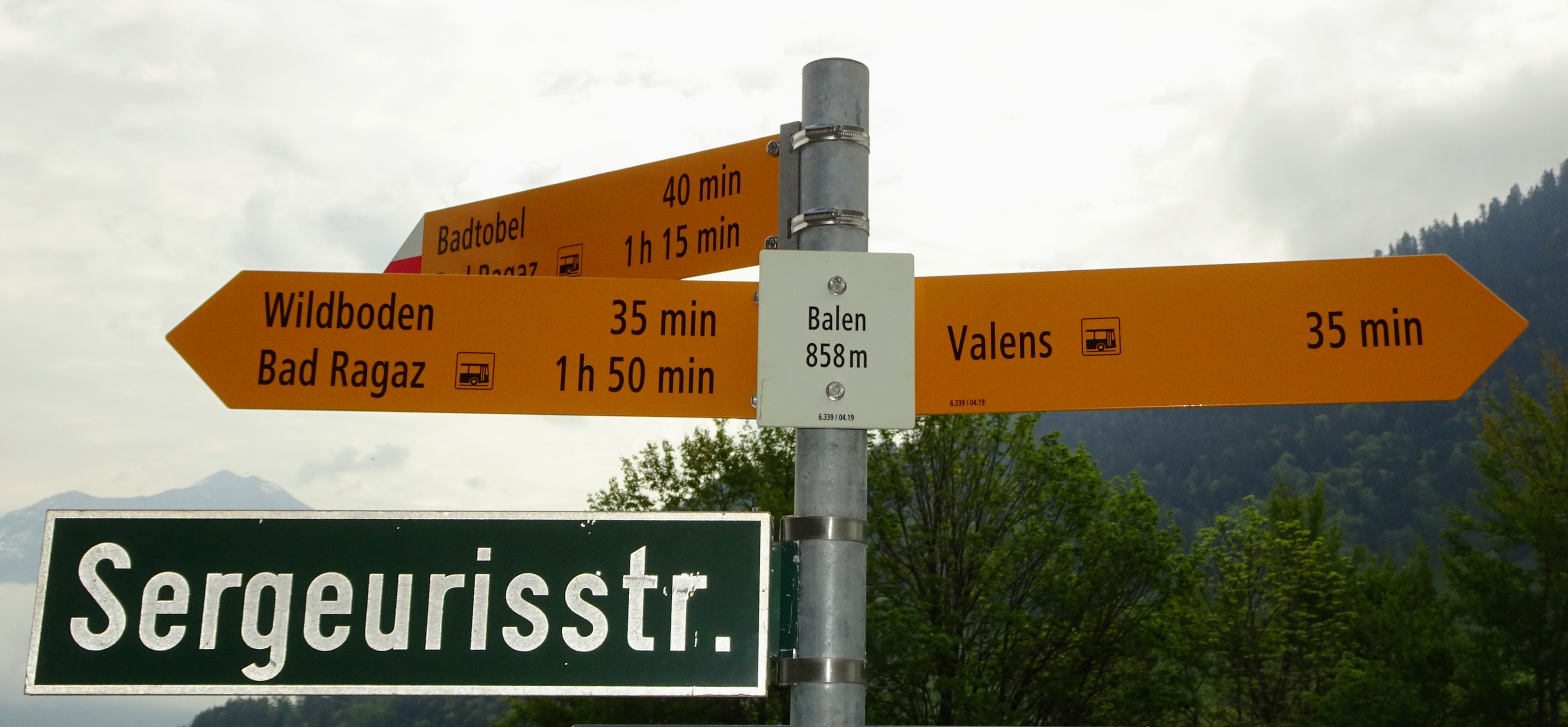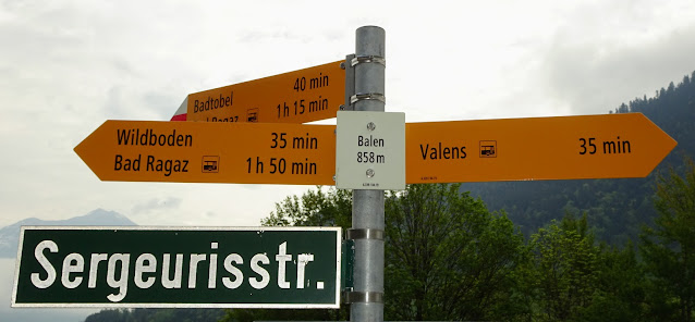 Der auf der SchweizMobil-Karte gelb eingezeichnete Hangweg ob Sergeuris in Richtung Hochrüti ist oberhalb Balen / Gassaura nicht durchgehend begehbar! Wir konnten ab ca. Koordinate 755’400 / 206’340 keine Fortsetzung der Wegspur finden. Dort, wo der Weg im Wald verlaufen sollte, liegt zudem kreuz und quer viel Fallholz. Wieder zurück, unten auf der Sergeurisstrasse, hörten wir von einem Landwirt, dass dieser Wanderweg zwar durchgehend geplant war aber schliesslich nicht erstellt worden ist. Bei der Postauto-Haltestelle Valens-Sandgrueb konnten wir über die Glattrütistrasse wieder zum oberen Weg aufsteigen.