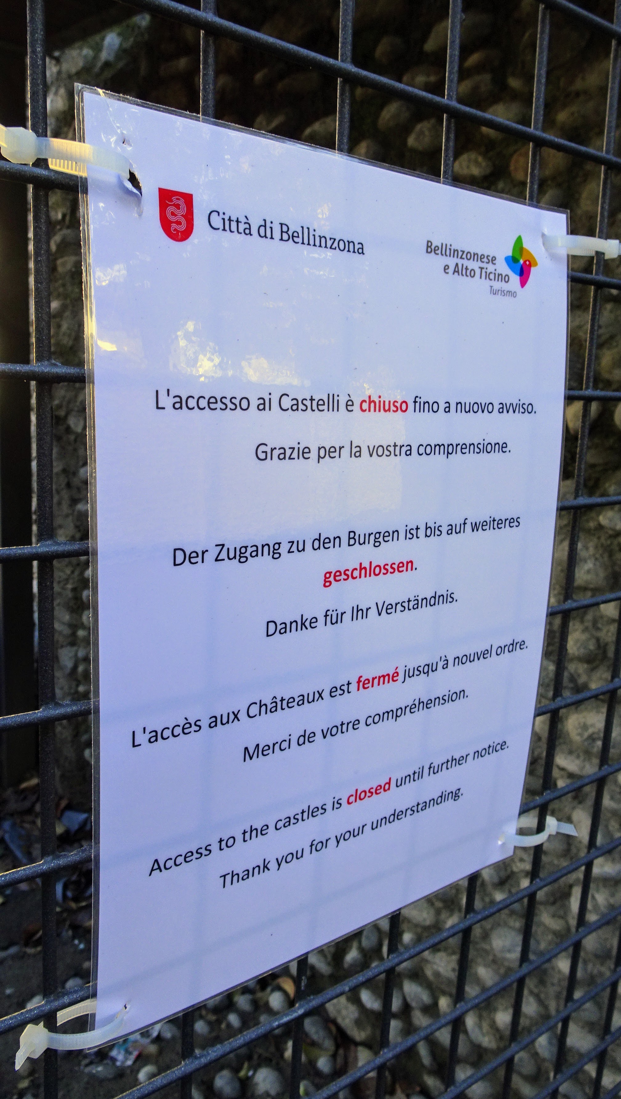 Der Weg durch Burganlage «Castel Grande» ist Corona-bedingt gesperrt!