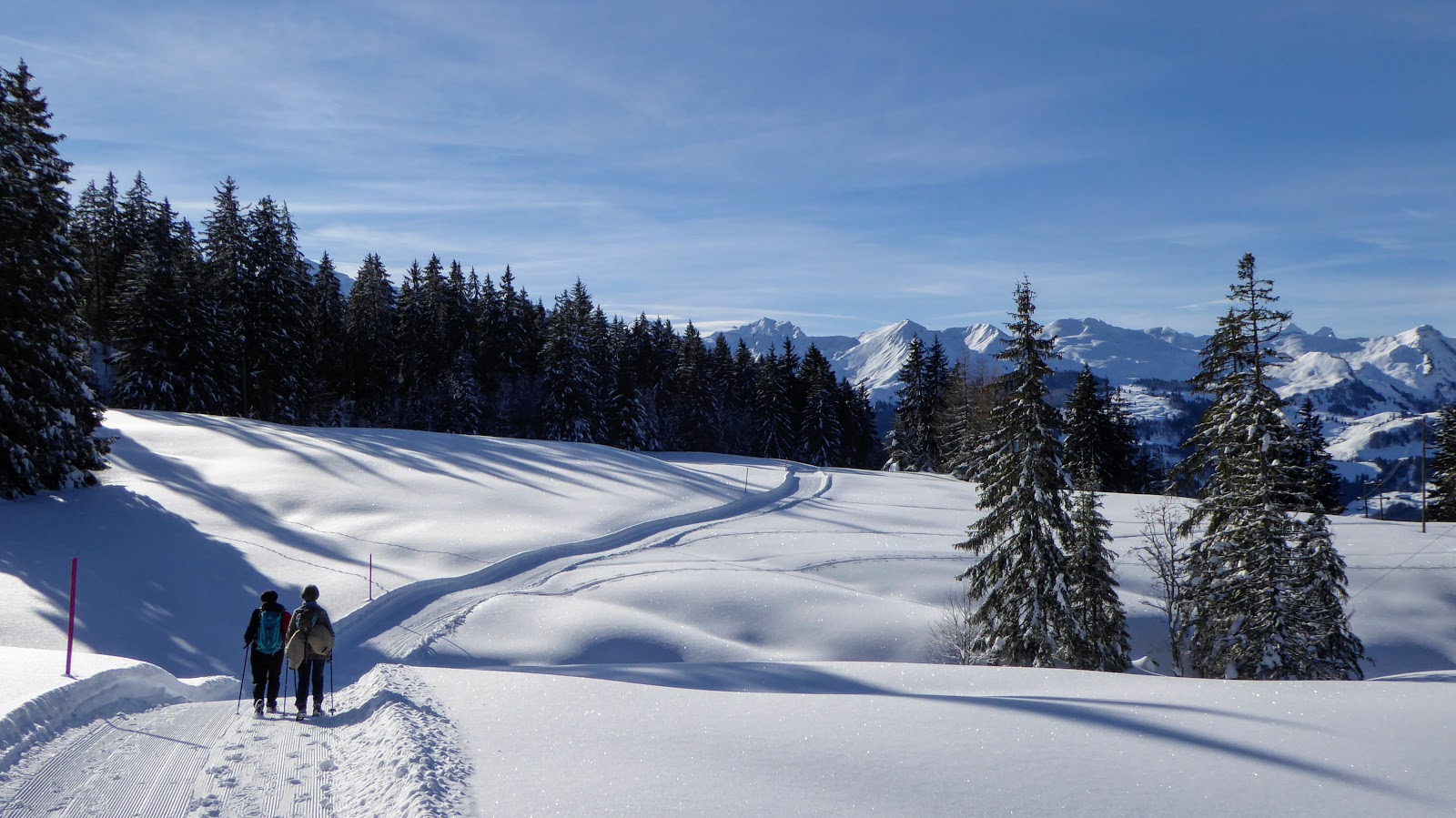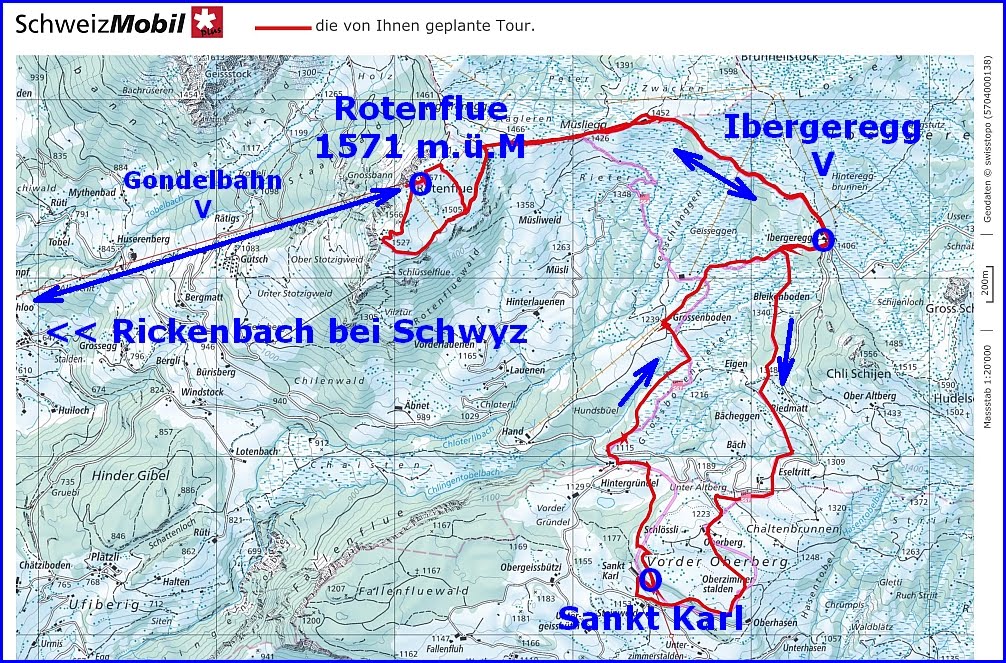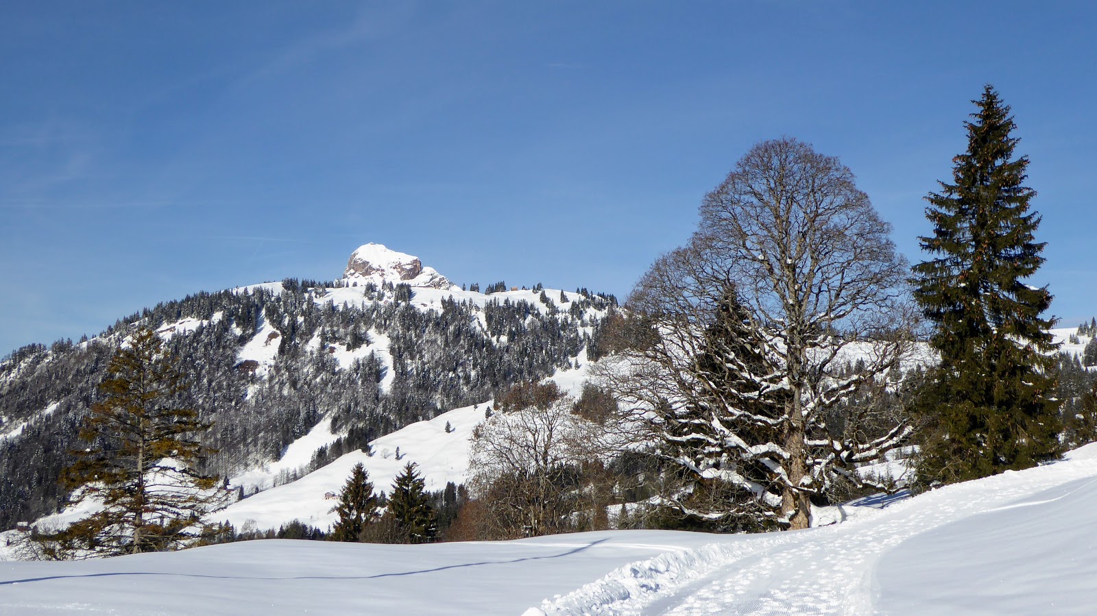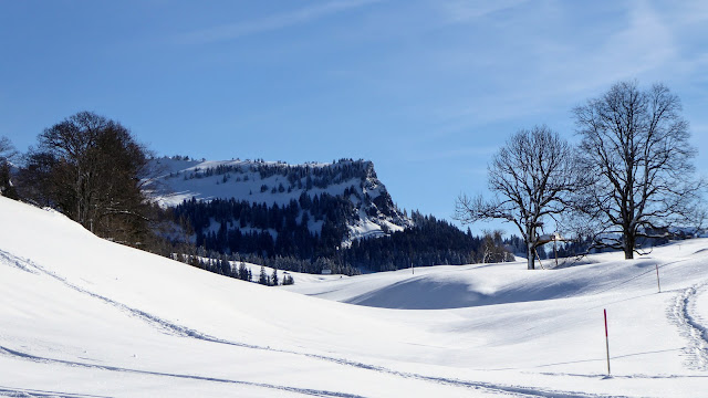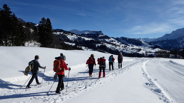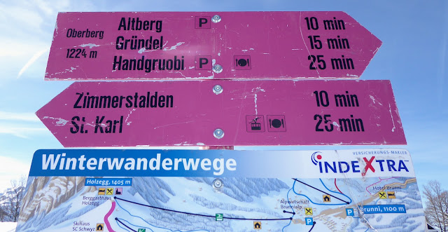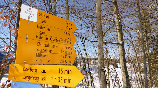 Ab der Rotenflue-Gondelbahn-Bergstation wanderten wir auf breit gespurten Schneewegen via Müsliegg / Ibergeregg / Oberberg hinunter nach Sankt Karl ob Illgau.