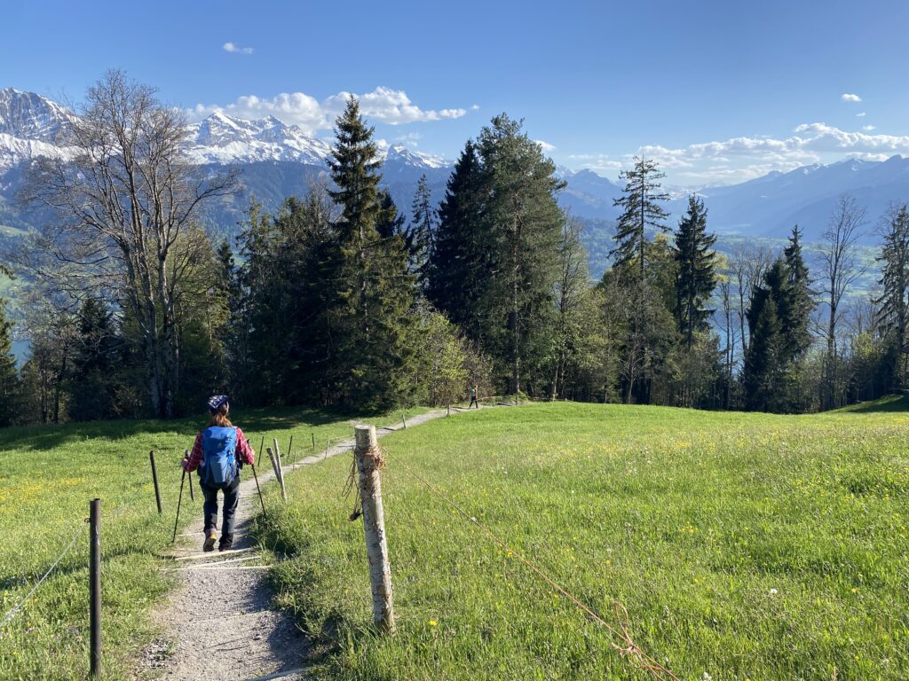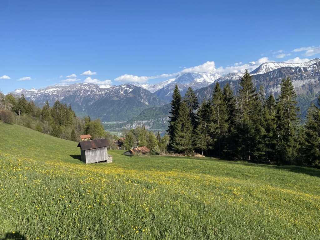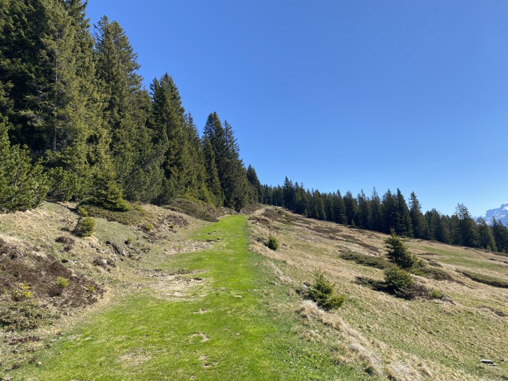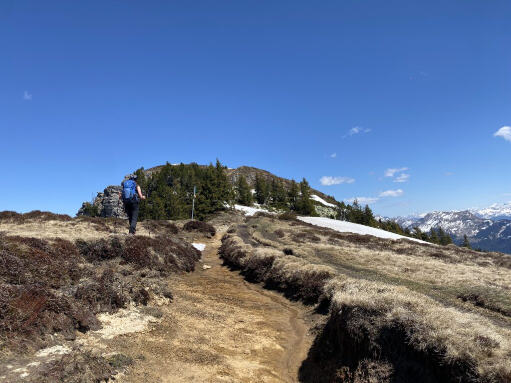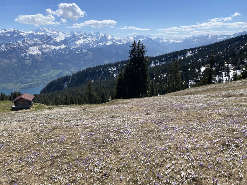 Am Samstag 25.4.26 wanderten wir ( Petra und ich ) auf das Niederhorn. Die Motivation war unter anderem Steinböcke und Krokusfelder zu sichten. Dafür wanderten wir schlussendlich ab Oberburgfeld statt nach Waldegg erst nochmals auf das Niederhorn und anschließend via Howald und Vorsass zurück nach Beatenberg.