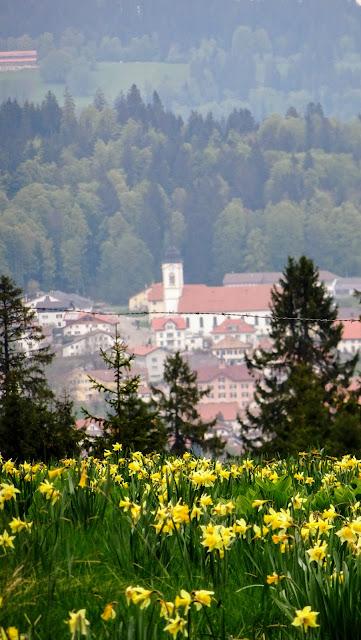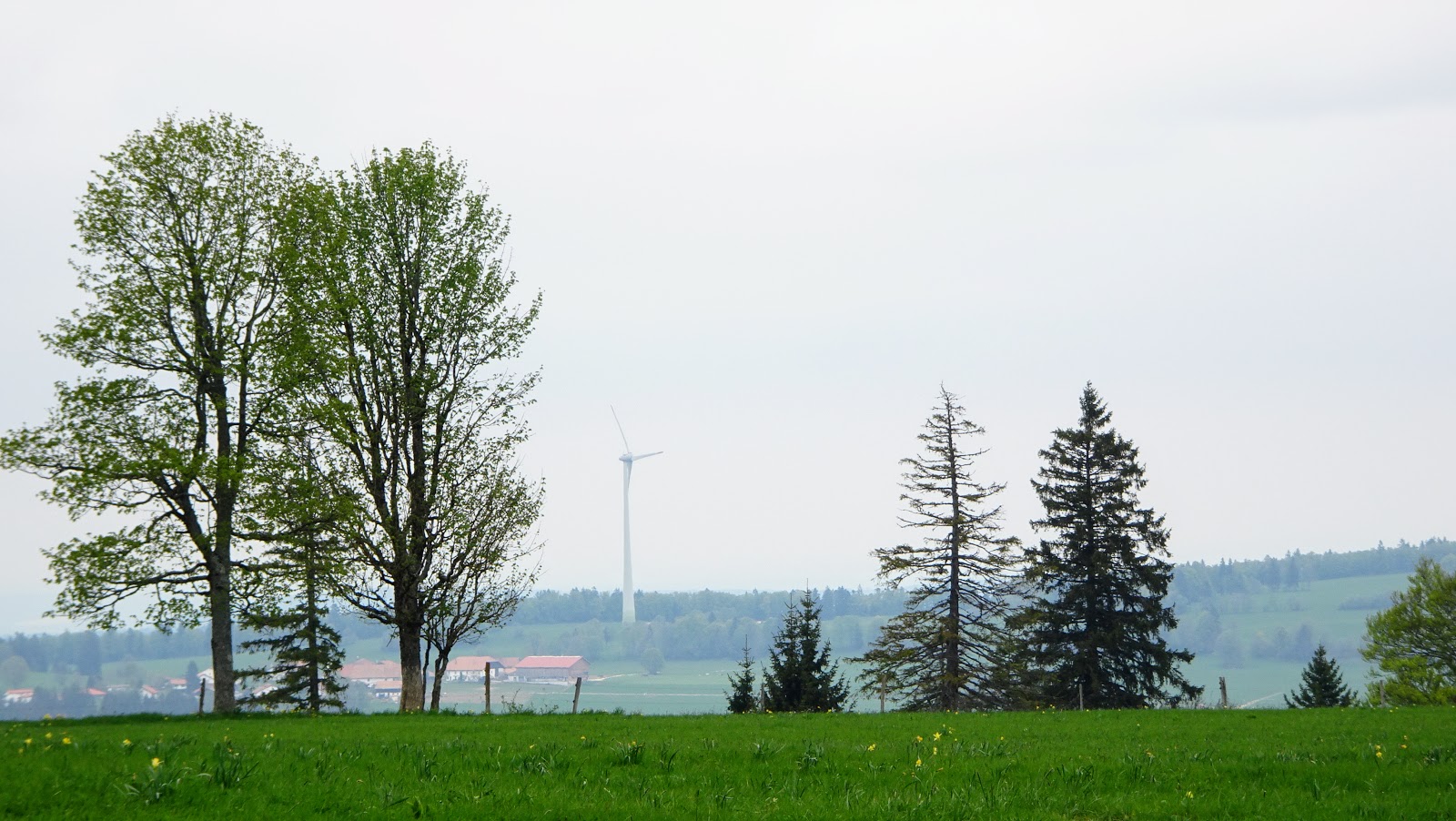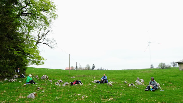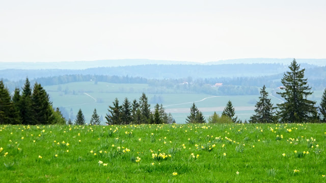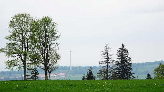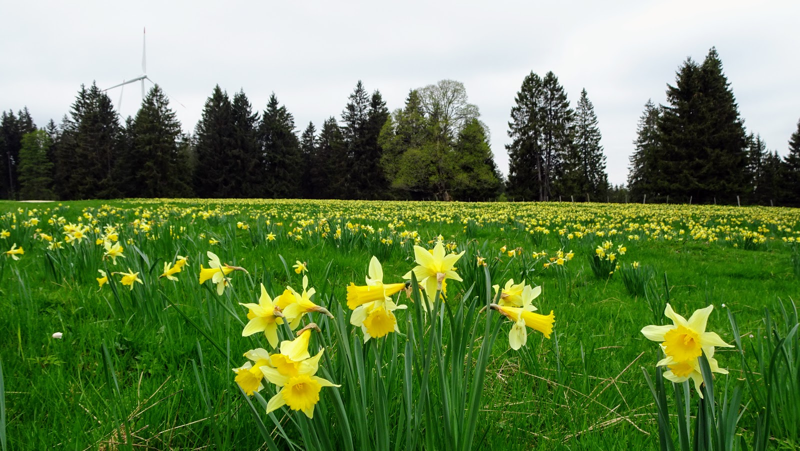 Zu den Osterglocken und Windturbinen auf dem Mont-Soleil im Berner Jura